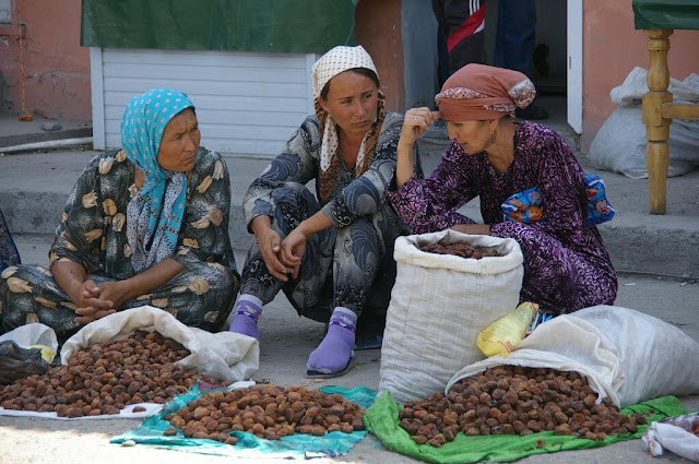 De mooie zijden stoffen uit de diverse "fabrieken", maar ook de kleurrijke kussens en matrassen, zoals we die al in Kirgizië dagelijks hebben gezien, worden verkocht op de grootste bazaar in Oezbekistan. De Kumtepe bazaar bezoeken wij op zondagochtend 8 september als deze al vol in bedrijf is. Het krioelt hier van de mensen en het is een komen en gaan van busjes, fietsen, taxi's en ezels. We hebben ons niet gerealiseerd dat de markt zo groot is en moeten een keuze maken. We besluiten in de stad van de zijde vooral over de stoffen- en kledingmarkt te dwalen. We nemen een karig ontbijtje van thee en droog brood, terwijl er overal om ons heen tegen achten shaslik, lagman, samsa en linzensoep naar binnen wordt gewerkt. Het leuke is dat je ieder gerecht bij een andere verkoper moet halen. Het theehuis zorgt alleen voor de thee en de voorzieningen (bed met matrasjes en tafeltje) De markt zelf is net een mierenhoop met honderden volgestouwde stalletjes die de meest uiteenlopende gekleurde stoffen of kledingstukken van zijde, katoen of een combinatie hiervan verkopen. Het is file lopen door de smalle paden en het is dringen bij de verkoopsters met de mooiste en goedkoopste producten. Veel traditionele kledingstukken worden aan de man gebracht; hoedjes, overjassen, laarzen, bontmutsen en jurken. De mensen zijn verbaasd om ons op de markt te zien en men maakt graag een praatje. Door al die aandacht verstrijkt de tijd sneller dan we willen. We kijken snel nog even bij de voedsel afdeling, voordat we een busje terugnemen naar het hotel. Hier staan de fietsen bepakt in onze kamer op ons te wachten.
